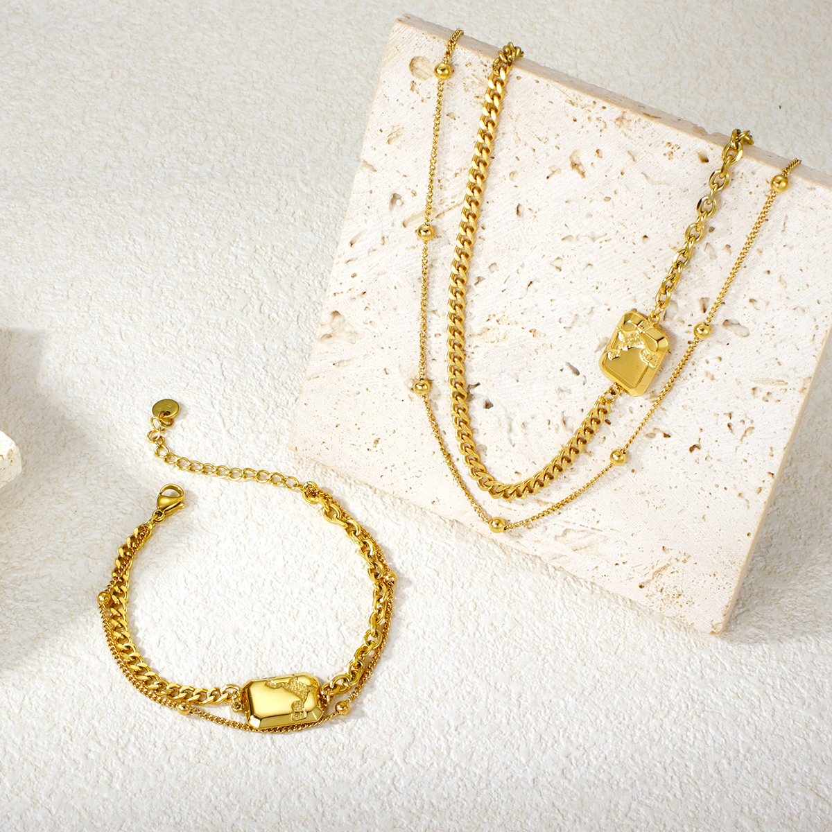 18K镀金不锈钢首饰复古双层链方形吊坠