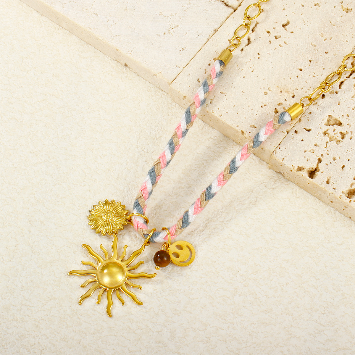 18K镀金PVD不锈钢链条拼接项链,防水太阳雏菊花朵