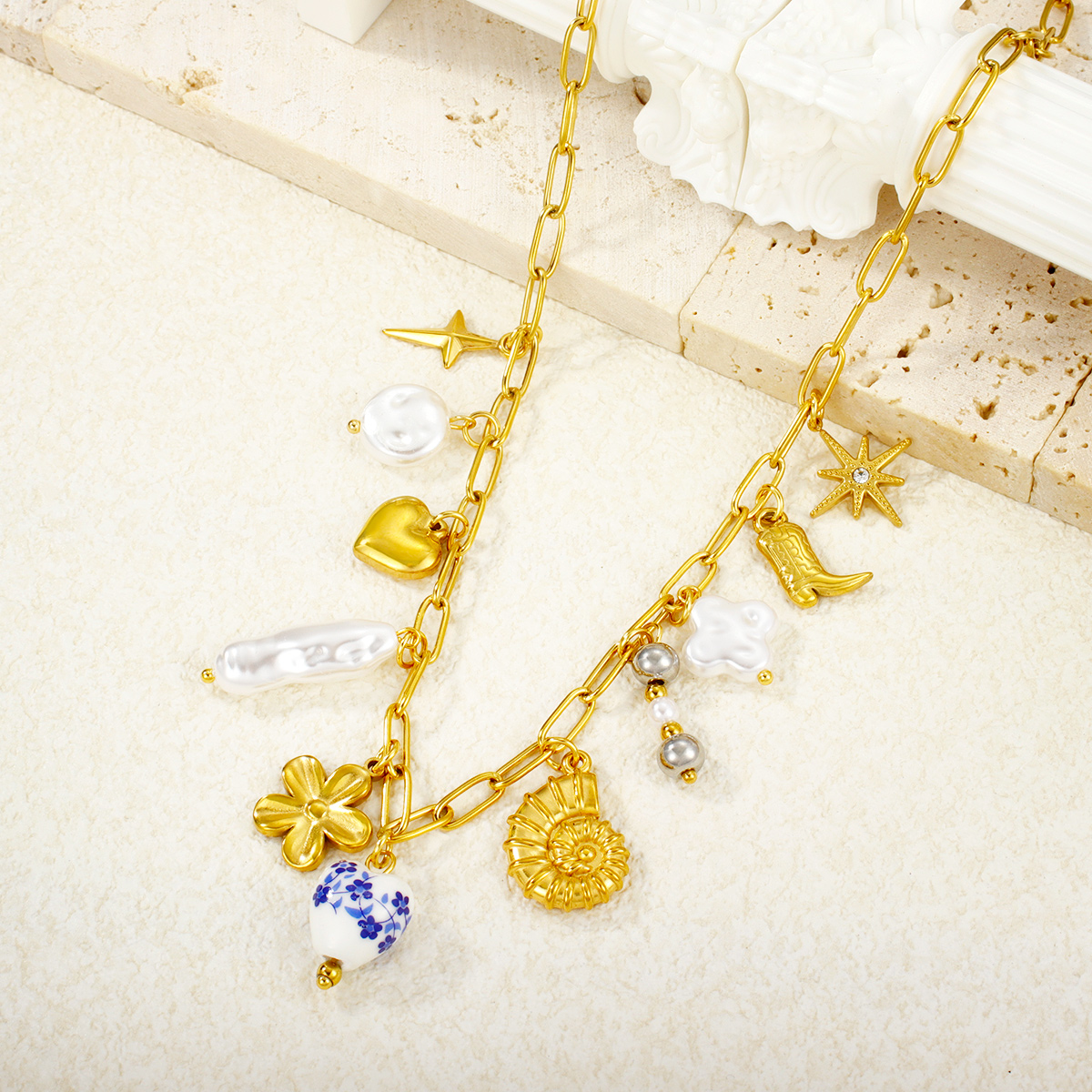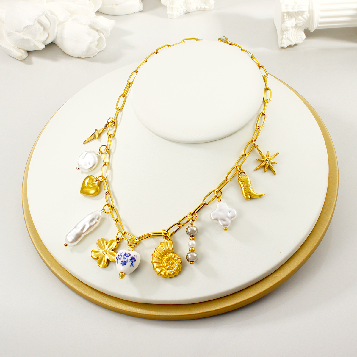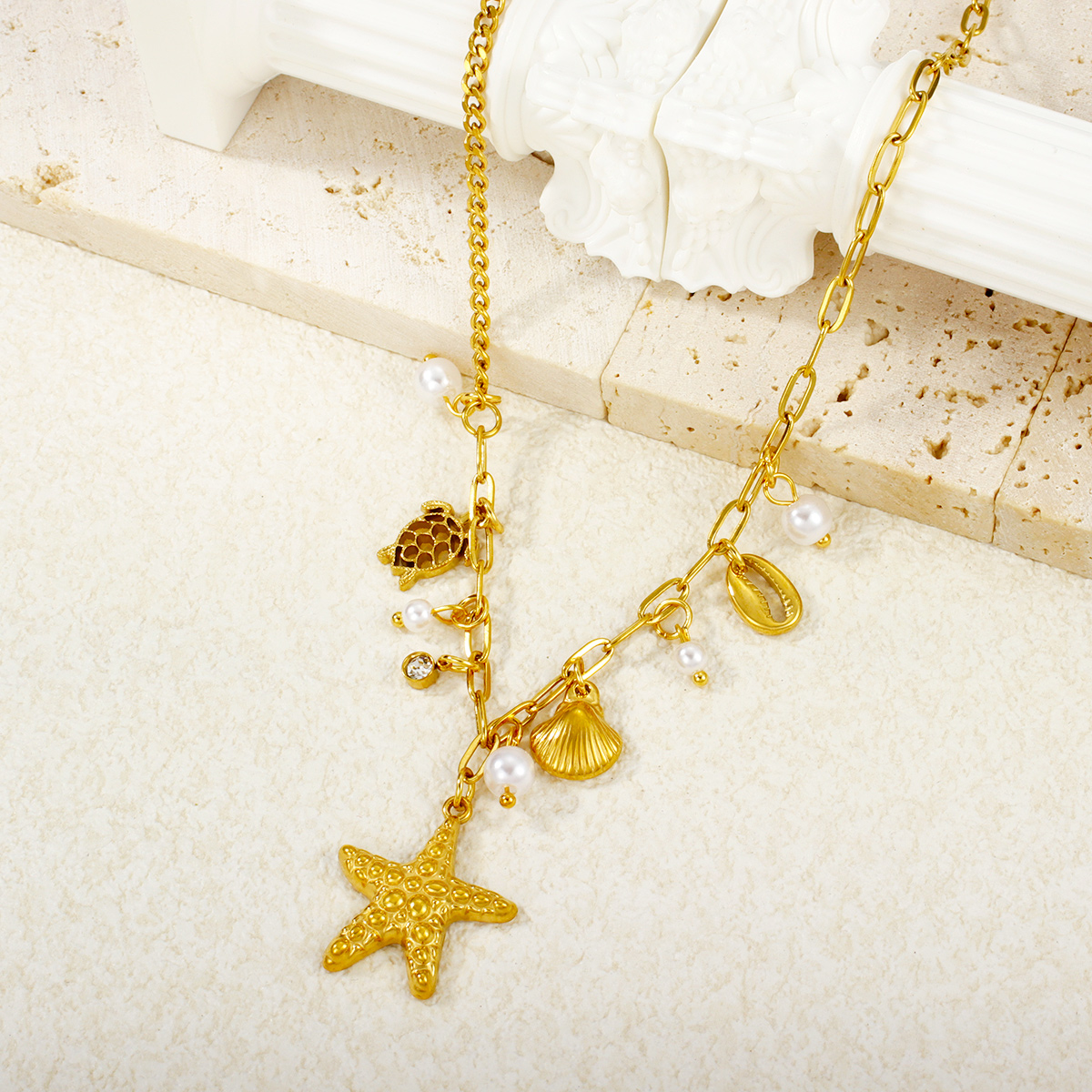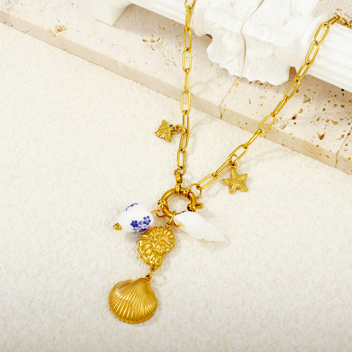 时尚18K镀金不锈钢太阳贝壳陶瓷鱼项链